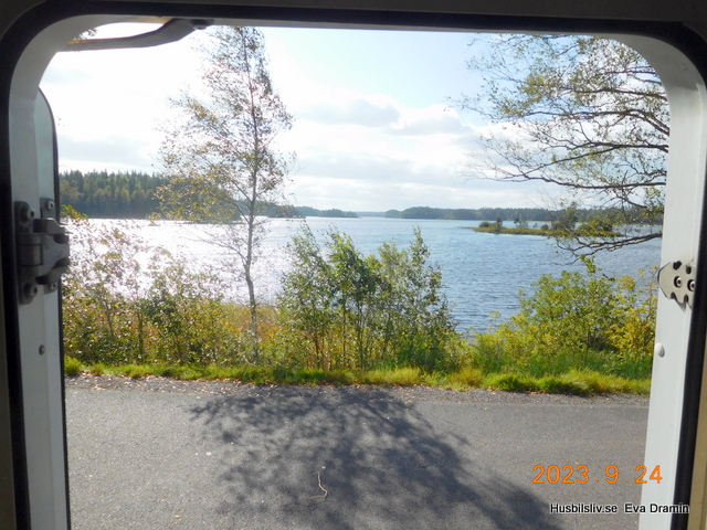 Vi stannade vid rastplats Sandsjön för att fika. Här blåste det rätt så mycket och dörren for upp med en väldigt fart. Men det var fint utsikt över sjön.