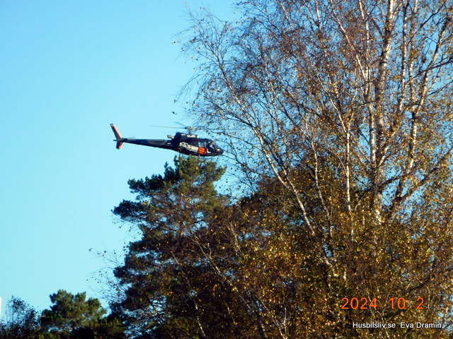 Hörde ett brummande uppe i luften. Tittade upp och såg en helikopter. Den landade en bit härifrån och jag såg den på marken utanför en större villa här. Såg den sedan igen uppe i luften med något hängande under sig. Ingen aning om vad den höll på med.