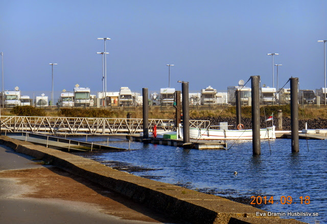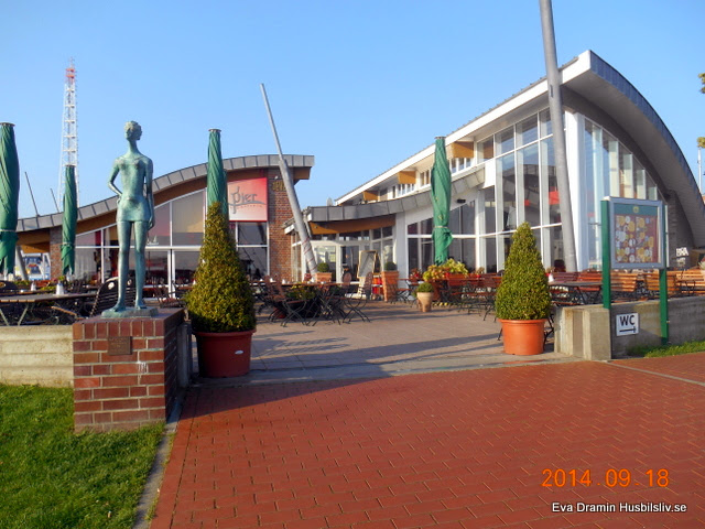 Vi var kvar i Cuxhaven och det är bild från andra sidan där man ser hur husbilarna är parkerade. Bästa läget var så klart längs fram. Vi var och åt en kväll på denna vackra uteservering.