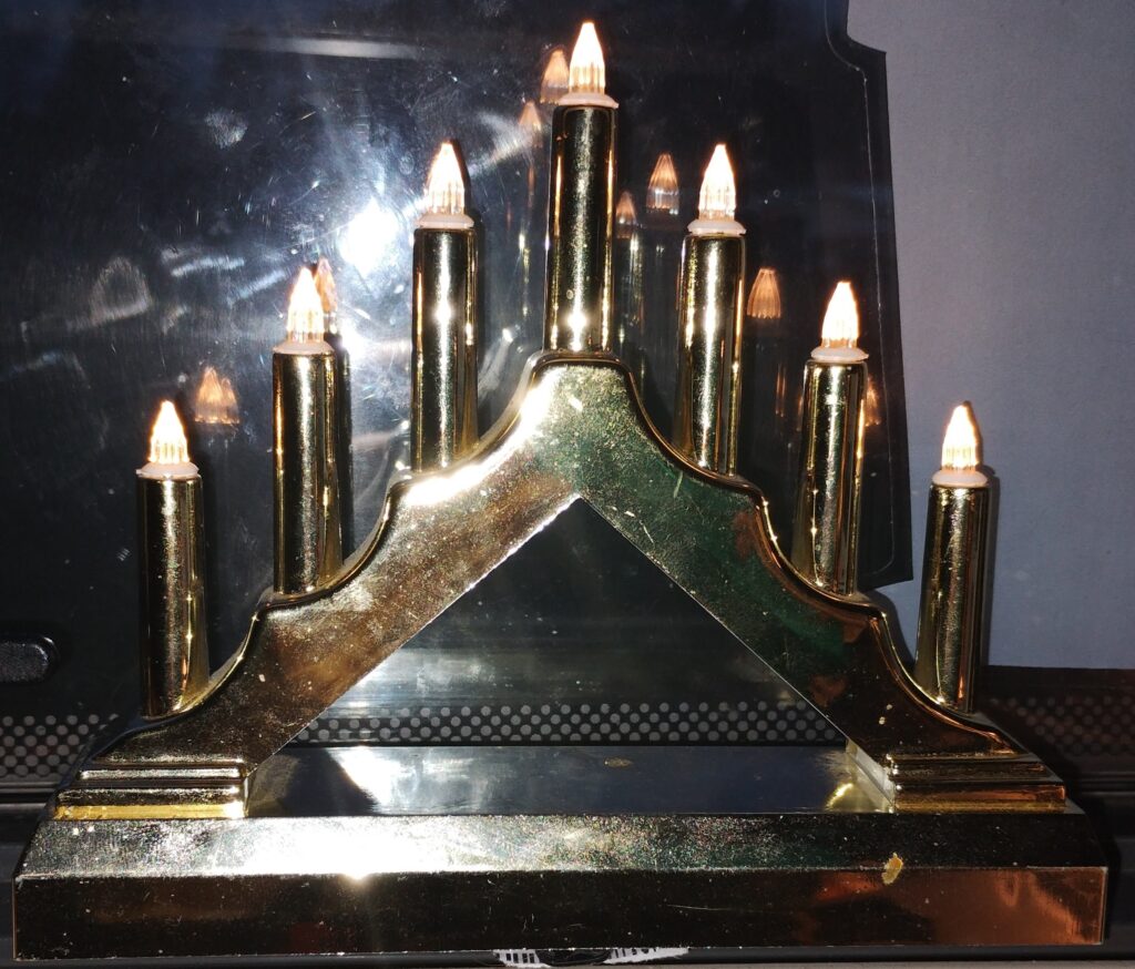 När jag lite senare kom hem så satte jag in nya batterier i min lilla adventsljusstake. Tryckte sedan på startknappen och då lyste dem med en gång utan problem. Satte den i fönstret och det kändes så trevligt. Dom två tomtarna som jag har satte jag i framrutan och där kan dom sitta och titta ut under dagen. På kvällen när jag drar för gardinen så får dom flytta ner i den vända passagerarstolen. Så var jag färdig med både advents och julpynt. Jag är för övrigt inte så mycket för allehanda pynt över huvud taget!
