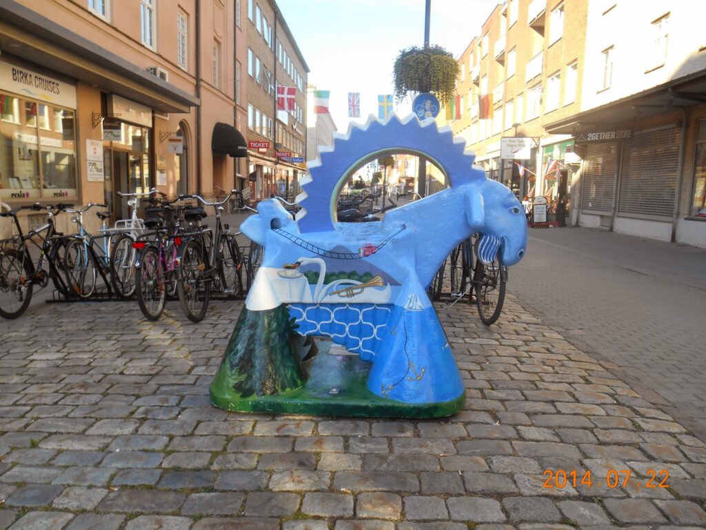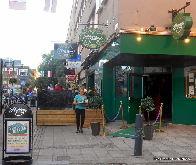 Finns många bockar på gågatan här som är målade på många olika färggranna sätt. På kvällen gick vi till Harrys och det låg nära ställplatsen. Zacko fick följa med och han la sig med en gång under bordet. Servitrisen kom omedelbart ut med en vattenskål till honom vilken han drack ur.